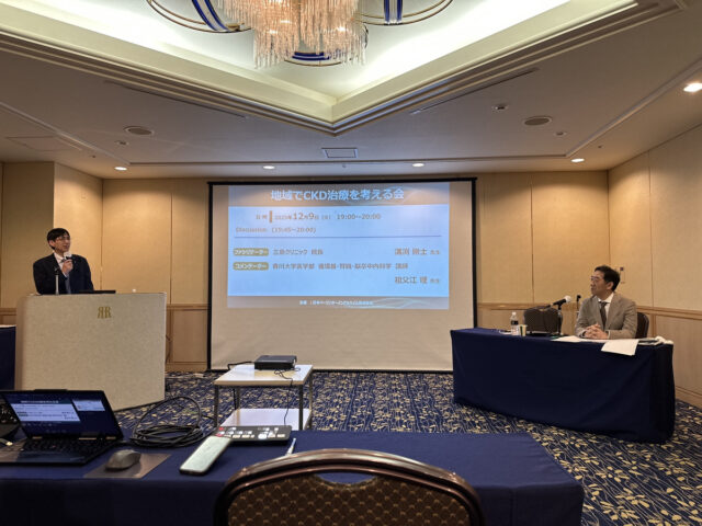 令和7年12月9日に開催された「地域でCKD治療を考える会」講演会において、当院院長が座長を務めました。 現地開催ならではの熱気に包まれた会場には、平日にもかかわらず、東予地区の多くの先生方が参加され会場は満席となりました。 講師には香川大学医学部 循環器・腎臓・脳卒中内科学 祖父江 理 先生 をお招きし、糖尿病治療のみならず、CKD(慢性腎臓病)における心腎保護効果を中心とした最新エビデンスがわかりやすく紹介されました。 今回の講演は、東予地区のCKD診療をさらに向上させる大変示唆に富む内容であり、今後の地域医療に直結する貴重な学びとなりました。 三島クリニックは、腎臓専門医が常勤する医療機関 として、慢性腎臓病(CKD)・糖尿病治療の最新知見を積極的に取り入れ、これからも地域住民の皆さまの健康と医療の質向上に貢献してまいります。![]()